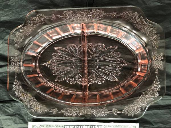 This stunning, antique (1920's) Jeannette pink depression glass divided dish in the Adam design, is in better than GOOD condition. The dish measures 8" long, 5 3/4" wide, and 1 3/8" high. There is a small chip on the underside which is not readily noticeable and does NOT affect the usability of the dish. I will meet the buyer in Morehead City, NC for local pick-up. The price is $10.