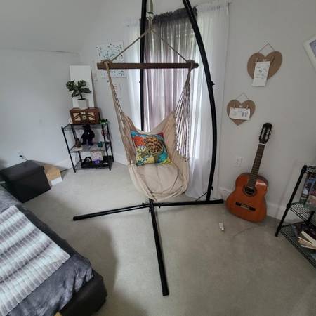 Hanging chair rarely used if at all. Like new condition. Price drop, includes stand which was purchased separately. Contact Mark